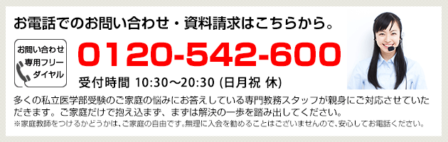 少しでもご興味をお持ちいただいた方は、まずは資料(無料)をご請求ください。『知らないと損する医学部受験』の資料一式と併せてお送りいたします。